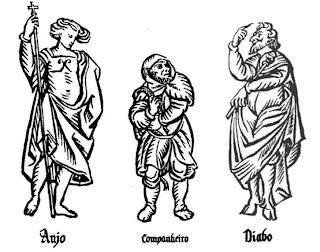 - um manto e pajem (criado) que transporta uma cadeira de espaldas. Estes elementos simbolizam a opressão dos mais fortes, a tirania e a presunção do moço.